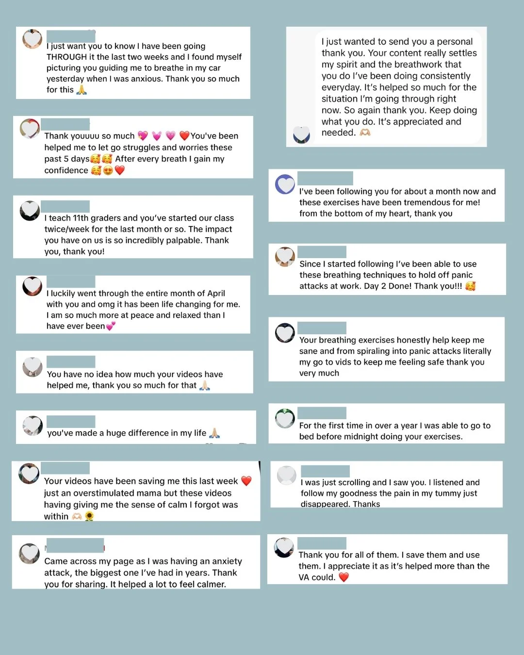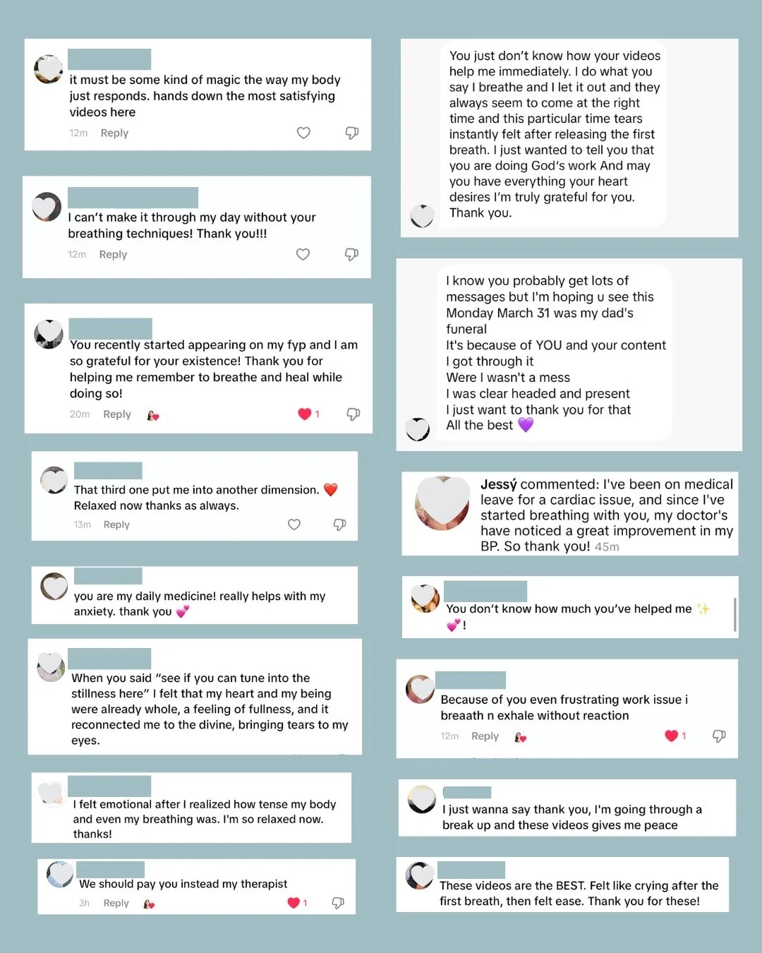 I absolutely loved the session! It was so needed for me to be at center with myself and to just allow myself to feel. I really took to heart what you said about not being safe in your body and it really described everything I was feeling such as why I haven’t been able to cry even though I want to and I just wanted to say that these sessions have been helping me so much to be comfortable with the silence, hearing my own breathing and learning that it’s okay to lose control in your own body. Jane’s aura and spirit are absolutely beautiful and so kind that I felt so comfortable following you on TikTok. Doing the breathwork sessions have been so impactful for me because I’m learning to let everything go and just feel!